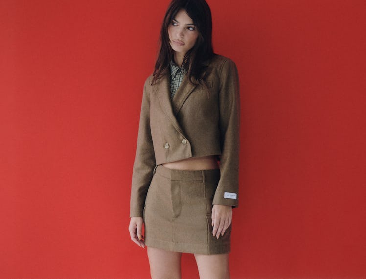 Made up of 21 items including flared denim, tailored skirt sets, vegan leather coats, and midriff-baring tees (this is an Emily Ratajkowski-designed collection after all), the capsule takes inspiration from the icon’s bicoastal lifestyle. The through-line is in the details that give utilitarian pieces a sultry edge, like miniskirts with cargo pockets or baggy jeans with a hip-baring rise.