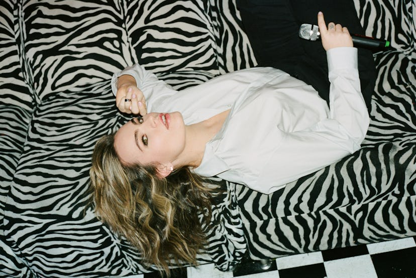 Kathryn Gallagher at Planet Rose Karaoke in the East Village. She wears a The Row shirt, COS pants, Converse sneakers, and Falke socks, styled by Lizzy Wholley. Photograph by Chris Shonting for W Magazine.