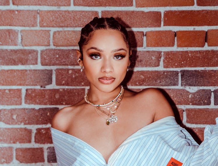 Growing up in Southern California’s Inland Empire, Barron got her start as a dancer, competing with her performance art school’s dance crew to travel to different states for competitive cheer, hip-hop, lyrical, and jazz. After doing some plays at her local theater, she realized she wanted to act, and began to appear on Disney Channel series like Shake It Up and Good Luck Charlie, before acting on dramas like Shameless and lending her voice to the animated series Twelve Forever. “I’m incorporating a lot of hip-hop culture, and a lot of Black culture and Mexican culture in what I’m doing right now,” Barron, who is of mixed Black and Mexican descent, told W. “I’m bringing a new piece of cake to the cookout.”