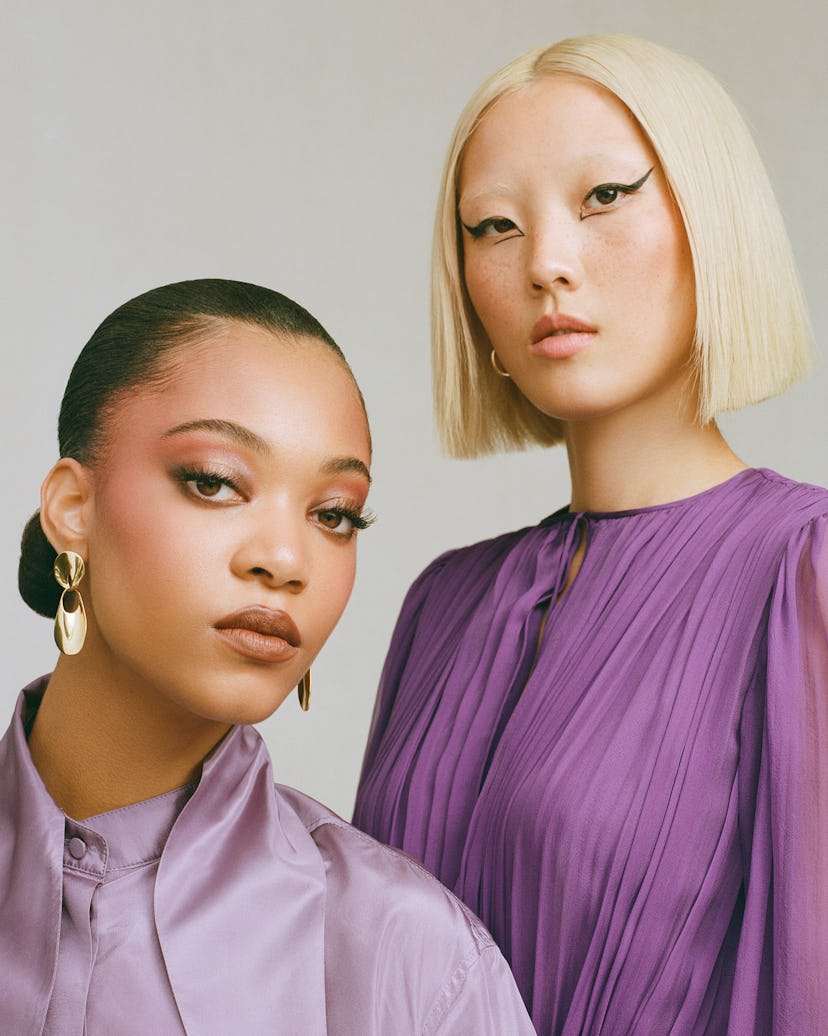 When creating the abstract liner look, Karakeosian says she was further inspired by the model’s structured haircut and bleached brow. “I always come in with an idea but then once I get to look at the model’s features, I really allow them to inspire me as to what I’m going to do next.” Her pro tip for getting a super-elevated wing? Sketching the shape first with the brand’s Brow Trio Eyebrow Liner before going in with the Twin Liner Eyeliner. “I draw it out with the pencil and take a step back to make sure it’s what I want, then I go in with the liner on top.” She also recommends taking a step back to look at your liner as you go along to ensure your wings turn out symmetrical. To finish the eyes, Karakeosian added an additional inverted wing with negative space on the inner corners of the model’s eyes before swiping on a few coats of the brand’s Magnificent Mascara.