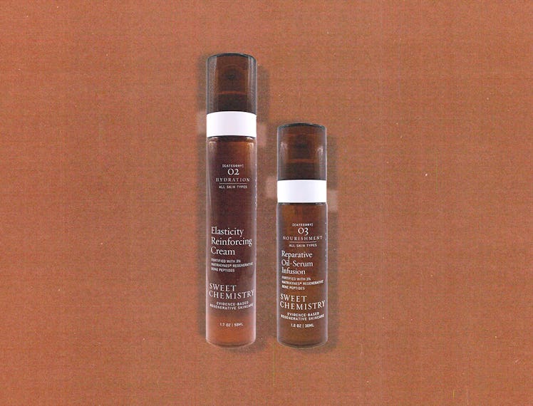 Enter: the Sweet Chemistry Max Repair System, which I was recently given to test out. The advanced two-part skincare system was created by Dr. John O’Neill—who ran Columbia University’s Laboratory for Stem Cell and Tissue Engineering—and Alec Batis, the former VP of global marketing for NARS cosmetics who also happens to be a chemist. This cream and oil serum’s hero ingredients utilize the power of matrikine peptides—which Sweet Chemistry gleans from upcycled cow bones (the brand sources those bones from the meat industry, which discards them). This is the same technology used in tissue regeneration, organ transplants, and other medical procedures. Naturally, it has the power to transform the state of your skin. What impressed me was the water-to-active ingredient ratio in Sweet Chemistry’s Max Repair System. Their active ingredients comprise 40-45 percent of the product, vs. most skincare brands whose active ingredients make up only about 10 percent.