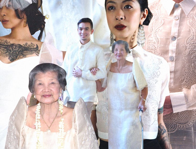 While I sifted through these memories, my cousin pulled out a framed photo of my grandmother, Erlinda. Immortalized within the brass frame, she dons a white dress that could easily be mistaken as a piece from a haute couture bridal collection. With a straight neckline and butterfly shoulder that would put Givenchy’s ‘90s power shoulders to shame, the Filipiniana dress is a symbol of esteemed pride. Considering that my grandmother reigned as my family’s matriarch, it is fitting that she would wear it, and be eternalized in a photograph with it on. According to my cousin, Kate, my grandmother wore this dress for the final time in the Philippines at my cousin Dyan and Colt’s wedding in 2015. “Well, I never expected to have a grand wedding, but I knew I wanted to pay tribute to our heritage,” Dyan said to me. While the dress on my grandmother easily signified her rank in our family, Dyan’s wedding entourage wore renditions of the same Filipiniana dress—some hemmed shorter, some worn traditionally, but still, with those signature butterfly shoulders.