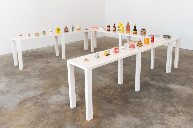 Shih’s latest work, on view at the new L.A. gallery Stanley’s until September 3, pays homage to the foodstuffs and goods that are hallmarks of Asian culture, but which have roots in the West—like those coveted items inside the suitcase. Titled New World Mall, the exhibition features life-sized ceramic sculptures of Spam, Libby’s Vienna Sausages (which is used for Filipino meatloaf and Korean “army stew”), and Carnation Condensed Milk—the sweetening agent in Vietnamese coffee and what’s used on toast from Hong Kong and Taipei in lieu of butter.
