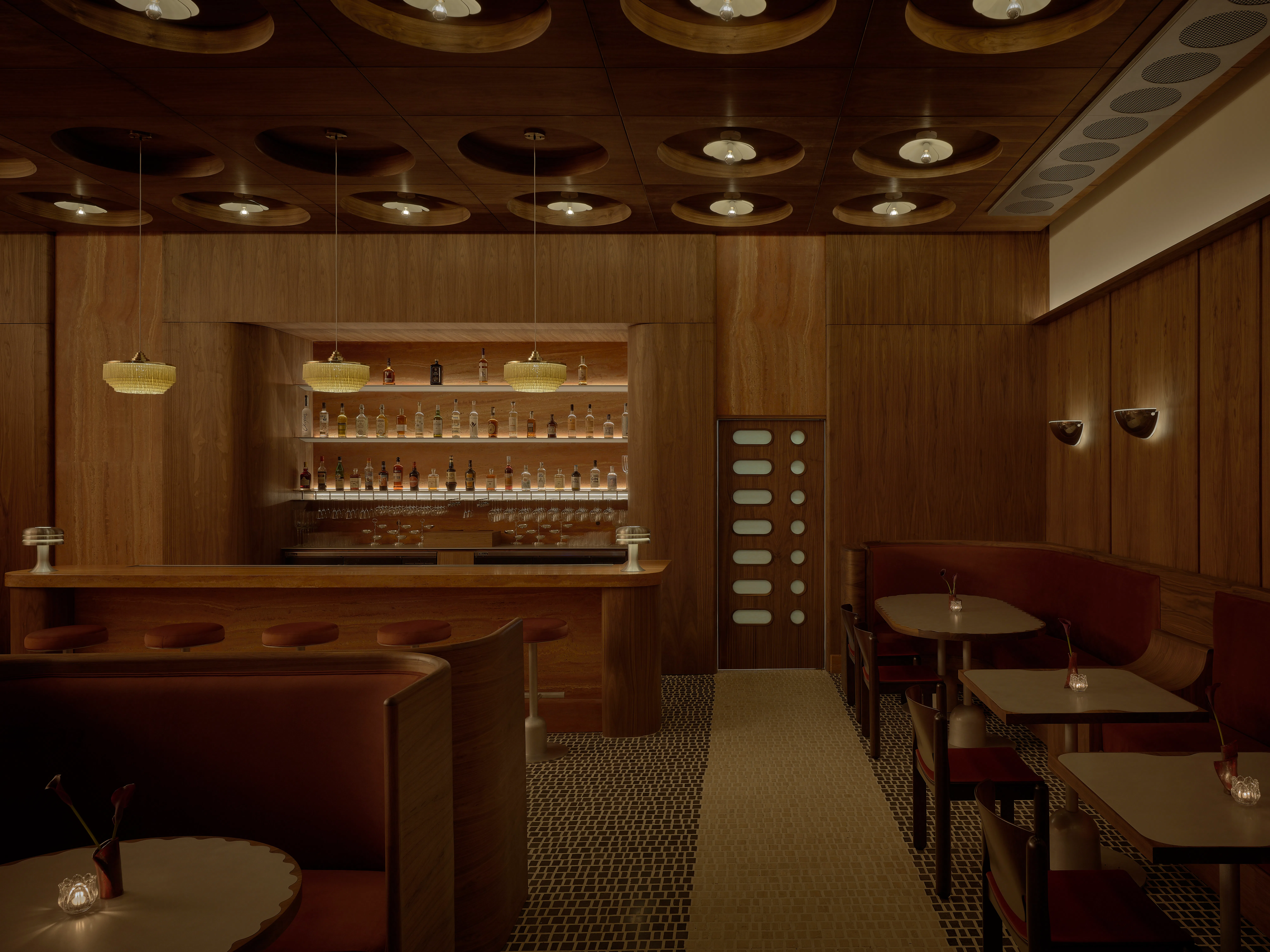 The space is rife with thoughtful touches: walls dotted with artist Brendan Lynch’s reproductions of Morandi and Modigliani works, built-in vases from Ceramics by STAUD for fresh flowers, travertine and basalt tiles patterned on the floor to encourage a particular flow of traffic. There are works from Italy all over Bar di Bello: the sconces are designed by postmodern Italian designer Tobia Scarpa (son of Carlo Scarpa) and the 1970s chairs are by Vico Magistretti. In a nod to the mish-mash of California design, there are global touches around the restaurant. The bar is made of red travertine from Iran and the dark wood found all over Bar di Bello is American Walnut.