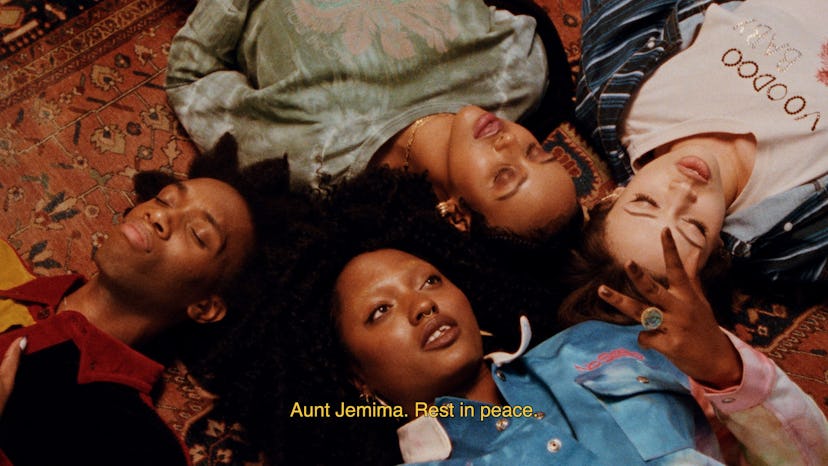 Harmon’s lack of proper recognition inspired the foundation of Blacktag: Black people and Black culture are responsible for massive global trends in all cultural realms—music, food, fashion, art, literature, even Twitter—but are rarely given credit or compensation for it. This idea is also the subject matter of the film, which stars Parker Kit Hill, Sage Elsesser, Eloisa Santos, Gabrielle Richardson, Miski, and Harmon. In Black Art Is Black Money, the group surveys a fictional coffee table book titled White Book of Atrocities. As they turn each page, the creatives read aloud a laundry list of cultural contributions originated by Black people and largely co-opted by white men and women: Bantu knot hairstyles, techno and disco music, phrases like “lit,” and “on fleek,” and even the popularization of AirPods.