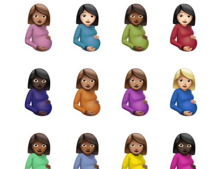 The composition of the Drake recalls Hirst’s spot painting series in which hand-painted circles of bright colors are interspersed on a white background. Here, of course, those spots have been replaced by the cartoonishly round digital bellies of the pregnant emojis.