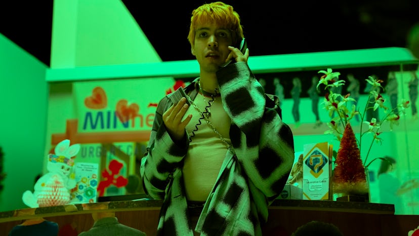 “Challenge” wouldn’t be an unfair word to put forth when describing Karmin’s task of dressing the ever-rotating cast of characters in Fantasmas, now streaming on Max. Many live within the faux New York City setting in which the main storyline takes place, but narrative side quests throughout the series’s six episodes introduce the viewer to an anthropomorphized punk rock “Q” (yes, like the letter), an ongoing trial between Santa Claus and one especially fed-up elf, and a gay nightclub-turned-CVS for hamsters. Luckily, Karmin was up to the task of costuming the parade of sketch characters that continuously march out of Torres’s mind, having worked with the writer, actor, and director on his 2023 film Problemista.