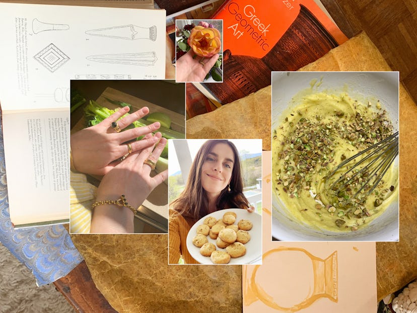 The jewelry designer Jean Prounis is known for her simple, elegant 22-karat gold pieces that reference Greco-Roman design motifs and the Art Deco flair of Versailles, the New York nightclub run by her great-grandfather in the 1940s. Now that she’s social distancing in upstate New York with her boyfriend and his family, she’s been looking to another relative for inspiration: her grandmother, with whom she shared a love of baking. She’s started designing pieces for her brand, Prounis Jewelry, on a makeshift jewelry bench she set up in the guest bedroom. In between those sessions, and virtual consultations with clients, she’s developed original recipes, referencing favorite Instagram accounts and restaurant cookbooks for inspiration. Throughout March and April, 10% of every sale from Prounis Jewelry went to a charity of the buyer’s choice—now, she’s working on a new selection of specific pieces that will offer a percentage to support those in need. Here, Jean shares her daily routine, and a recipe she whipped up for a delicious floral shortbread.