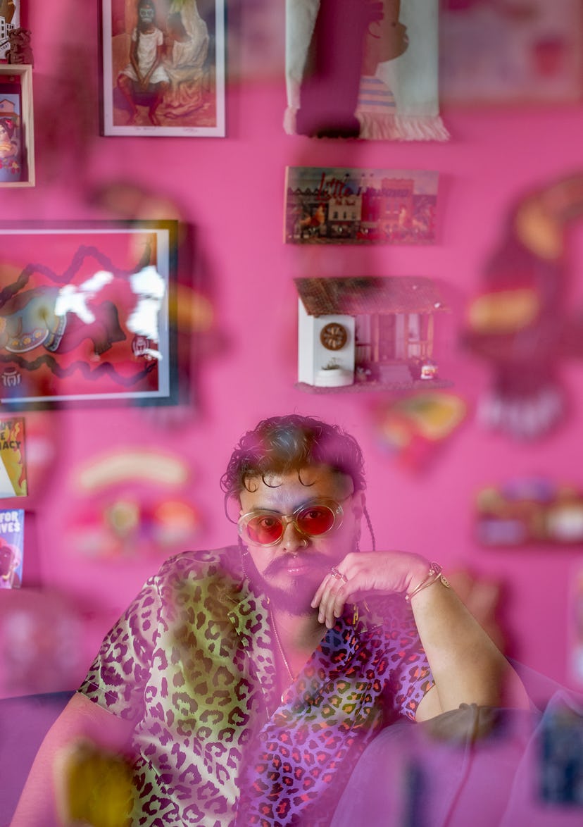 Amid a maze of white walls at the New Art Dealers Alliance fair during Miami Art Week in December 2021, there was one pink booth that caught my attention. The brightly colored exhibition titled “La Pulperia Doña Pina,” belonged to the ceramicist Joel Gaitan, along with the Miami-based gallery KDR305. His installation was decorated with a banana stalk, terra-cotta-tiled roofing, and shelves of colorful Central American snacks and condiments—all surrounding a selection of terra-cotta sculptures that simultaneously paid tribute to, defied, and expanded upon the history of Mesoamerican ceramics. (His exhibition was among a special selection made by 52 Walker’s Ebony L. Haynes to present at NADA Miami and highlight emerging artists.) I met Gaitan, 26, later that month in Little Havana, Miami near his home. With chartreuse-dyed hair and matching chartreuse sunglasses, he was as energetic, playful, and curious as his sculptures had appeared to me weeks before.