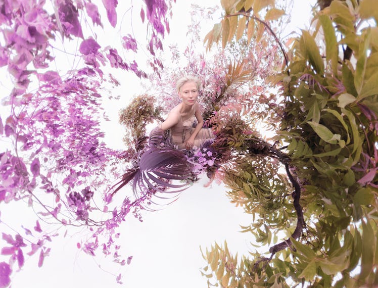 Clouds originally shot in Norfolk are projected onto Chinese actress Juan for a Magritte-like effect. Swinton poses among whimsical greenery, while Christie is bathed with light. “Sølve uses modern technology to enhance the creative process rather than replace it,” says Christie, who has worked with Sundsbø many times over the years, but is only now making her debut in The Cal. She reflects on her studio experience, calling it “almost ritualistic.” To create the eerie ether effect, Sundsbø used a long exposure as he dragged a fiber-optic light over Christie. “It was so homemade,” Sundsbø says with a laugh. The results are anything but.