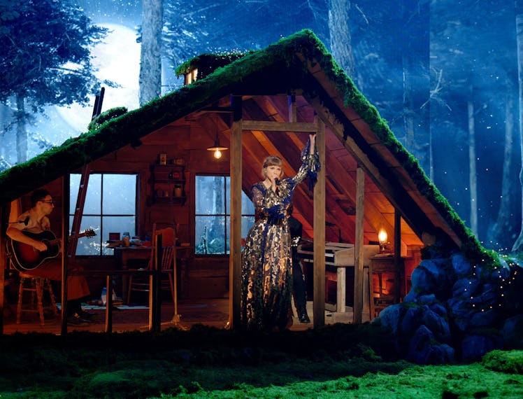 She began with “Cardigan,” for which she was seen lying on the moss-covered ground, wearing a floor-length purple and gold Etro gown and a thin golden headpiece. (Swift was, it’s worth noting, barefoot—fully committing to the cottagecore bit.) For “August,” she picked up her own acoustic guitar, and capped off the medley with “Willow,” which Swift performed while leaning against the wooden beams of her bungalow.