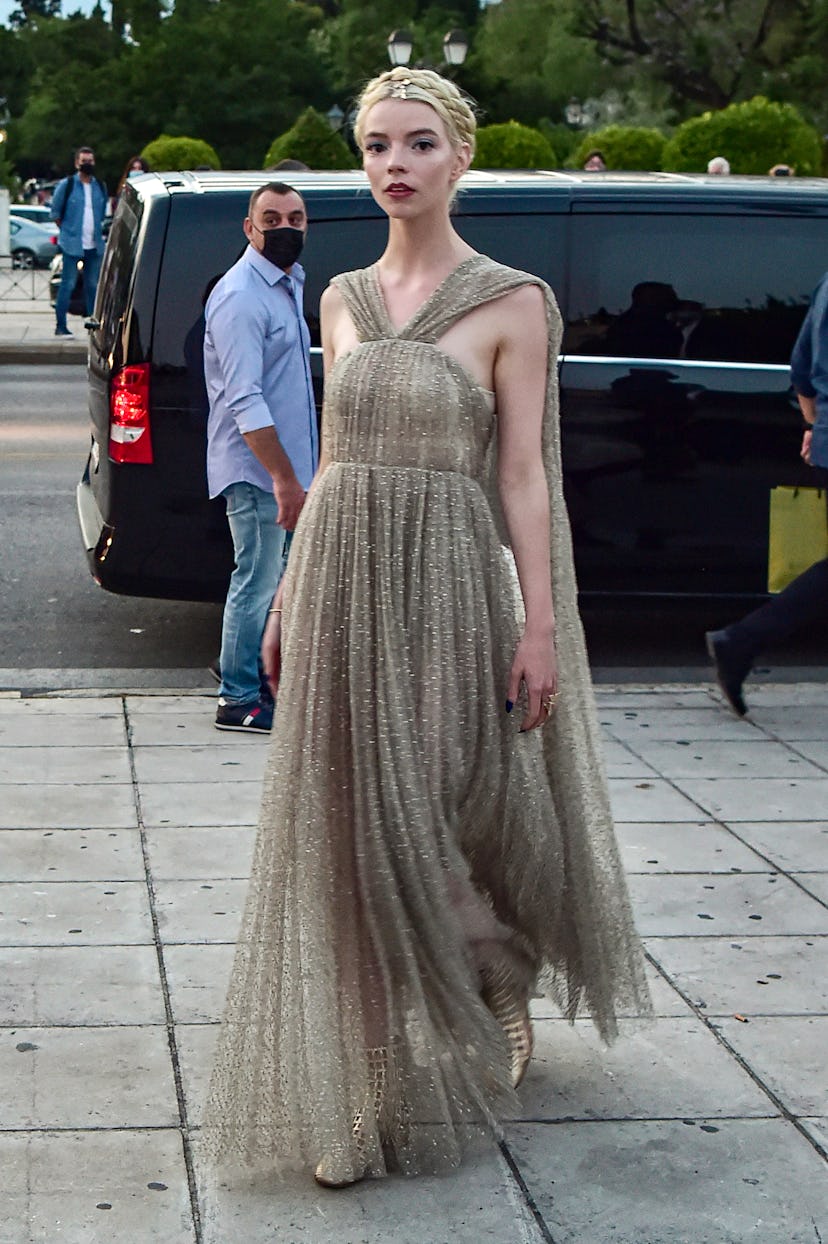 Anya Taylor-Joy attended Dior’s Cruise 2022 show today in Athens, Greece dressed appropriately for the occasion. Arriving with her braided hair wrapped around her head, suggesting something of a crown effect, she certainly looked like a Greek goddess. Her dress, Dior of course, was a shimmering, sheer champagne number that seemed fit to wear atop Mount Olympus itself. It’s the kind of outfit that would leave someone making offerings to Euphrosyne, the Greek goddess of, well, joy.