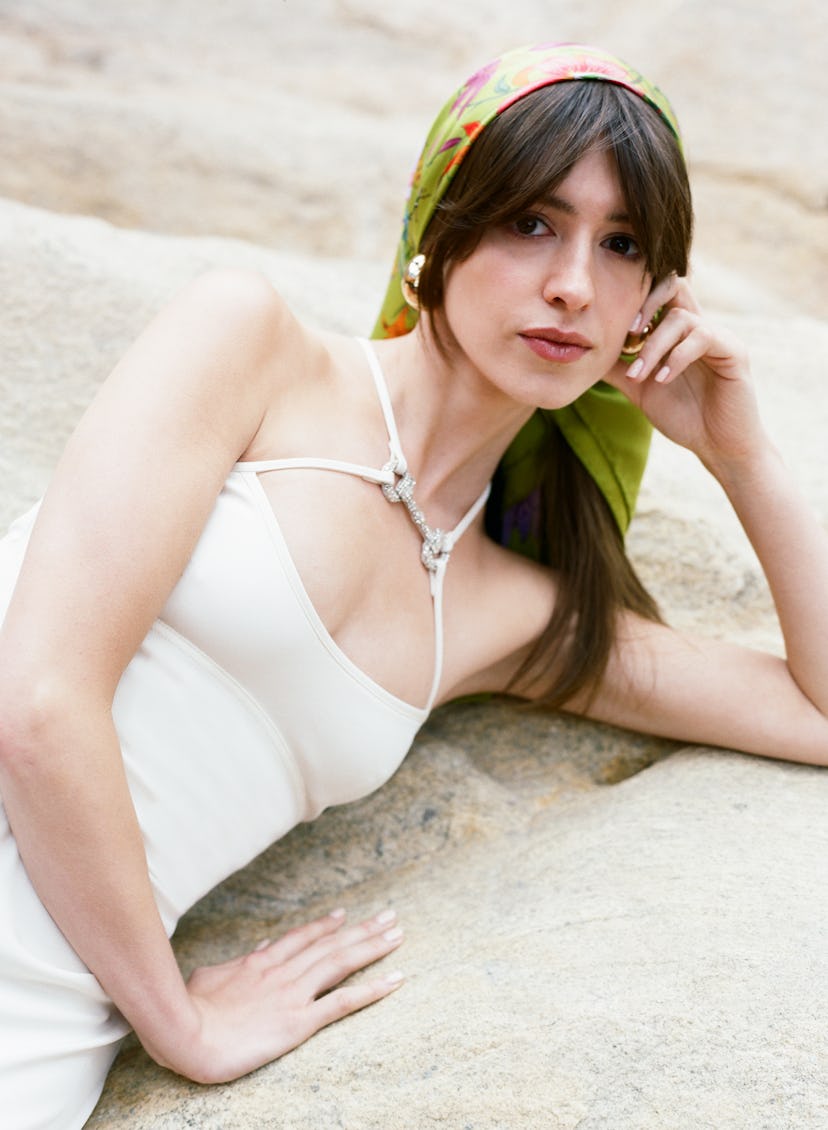 Throughout the film, Edgar-Jones is styled in Old Hollywood-style glamorous scarves — not unlike those from the House’s collection seen here — leveraging her wholesome, ’50s housewife look to mask a simmering queer yearning and a burgeoning gambling habit. This is a dream role for her.
