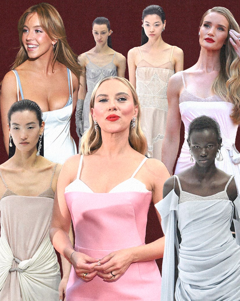First, to clarify, we’re not talking full-on bralette exhibition. That look has been in vogue for so long, it’s not even shocking anymore when someone steps out in, say, a blazer with nothing but a bra underneath. No, this newest look features just the top of the bra peeking out over the neckline of the dress. The effect makes it seem almost like a mistake, like your undergarments just slipped out, or your top dropped too low. It’s almost more scandalous for that reason, as it feels like a fashionable wardrobe malfunction, and brings the scandal back into the overdone trend of bras as shirts. The first to display the look in Cannes was Sydney Sweeney, who was seen exiting the Hôtel Martinez in a slinky light blue Miu Miu slipdress, which, even if worn on its own, would have proven the actress to be a lingerie-as-daywear advocate. But she opted to take it a step further, layering a satin blue bra underneath. The dress featured a lower neckline, exposing the tops of the bra cups and creating the desired layered effect.