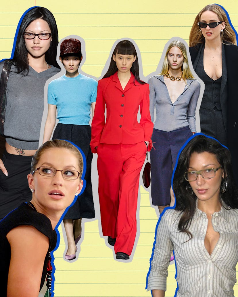 The beauty of trends is that there is truly something for everyone. While many may be celebrating a Brat summer with ab-baring crop tops, impossibly low-rise pants, and whale tails galore, others are getting to work. The Office Siren trend, which has been growing in popularity since the beginning of the year, has reached an apex recently as more have embraced this business-casual look with a sultry twist. Who knows, maybe it’s intern season that has us all reaching for button-downs and wire-rim glasses. But this trend is more than an updated take on traditional workwear: there’s a sex appeal to these looks (hence “siren”) along with a ’90s/’00s edge. Bella Hadid was one of the first to champion the aesthetic, sharing images on Instagram in a busty button-down and glasses. Since then, many other celebrities have followed suit (get it?), opting for tailored vests as tops, thigh-hugging pencil skirts, and reimagined pinstripes. But you don’t need to work a 9-to-5 to take on the trend. Models like Gabriette have proven that throwing on a pair of early aughts-style glasses can be enough to join in on the look.