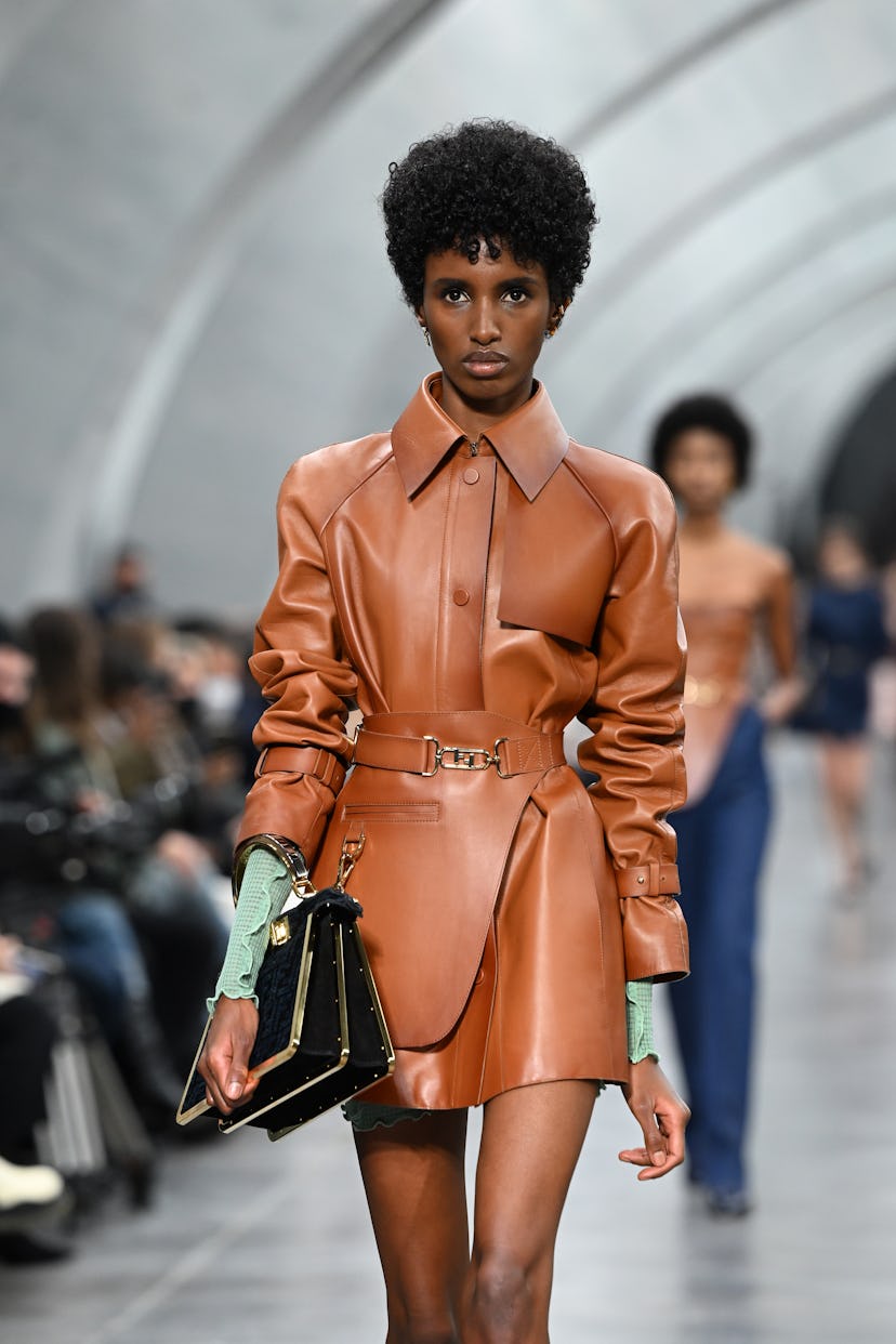 Of course, it wouldn’t be a Fendi show without a focus on the bags. The classic baguette style has been enjoying a bit of a cultural revival as Gen Z discovers it for the first time on popular resale shopping apps—plus, the purse played a starring role on the Sex and the City reboot And Just Like That in late 2021 (it also happens to be the bag’s 25th anniversary). So in turn, the brand delivered on its promise of giving us new versions to covet: three re-editions in cashmere, shearling-lined leather, and intarsia mink.