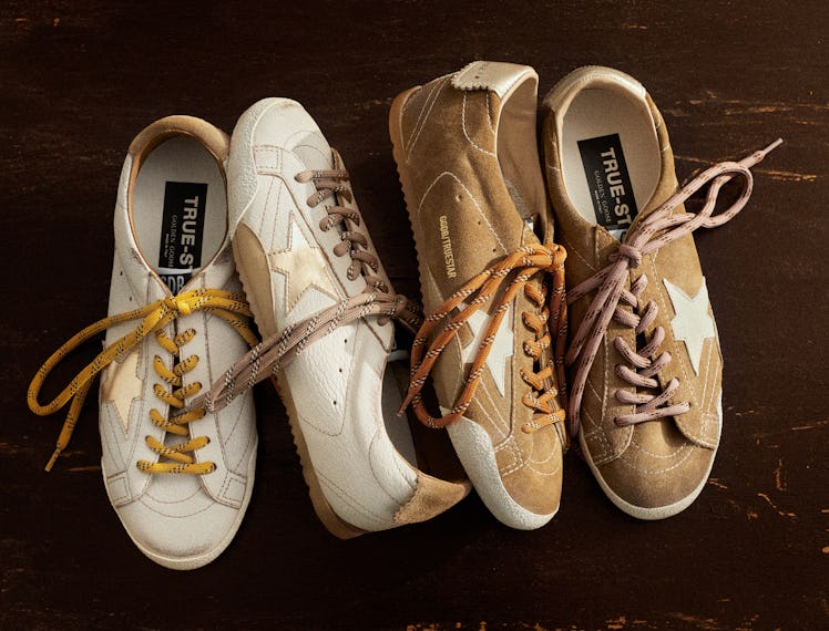 Golden Goose’s iconic True-Star gets a festive refresh in burgundy patent leather and black suede covered in Swarovski crystals, plus winter-appropriate tones in tobacco suede, white nappa with gold, and pastel pink suede. Every pair can be customized with new lace sets in various fabrics, embellished with charms, pins, crystals, and pearls.