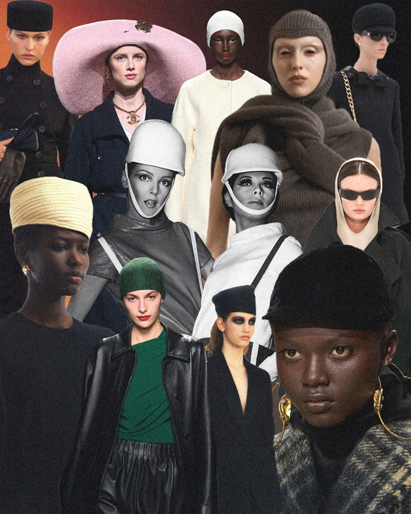 There’s a protective quality to this type of headgear, too; when worn, it looks as if one might be preparing for battle. The so-called “Atomic Age” of fashion—a movement spearheaded by Andres Courrèges, Paco Rabanne, and Pierre Cardin in the ‘60s—gave birth to similar styles that look like a cross between a bonnet, helmet, and an aviator cap. Fitting, when you think about it, for an era that was engulfed in the cold war.