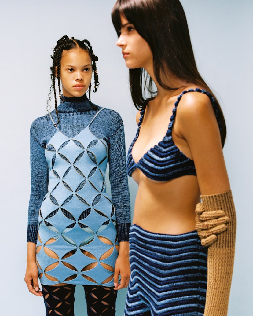 “We try to play with these stereotypes of sexy garments and make them more tactile and somehow sexy,” Basari tells W. “But the starting point for most of our collections would be the craft of it. I’ve been obsessed with our yarn for maybe two years now. I love knitwear because of the different kinds of knitting techniques, even crochet, and all the different ways you can explore the material.”
