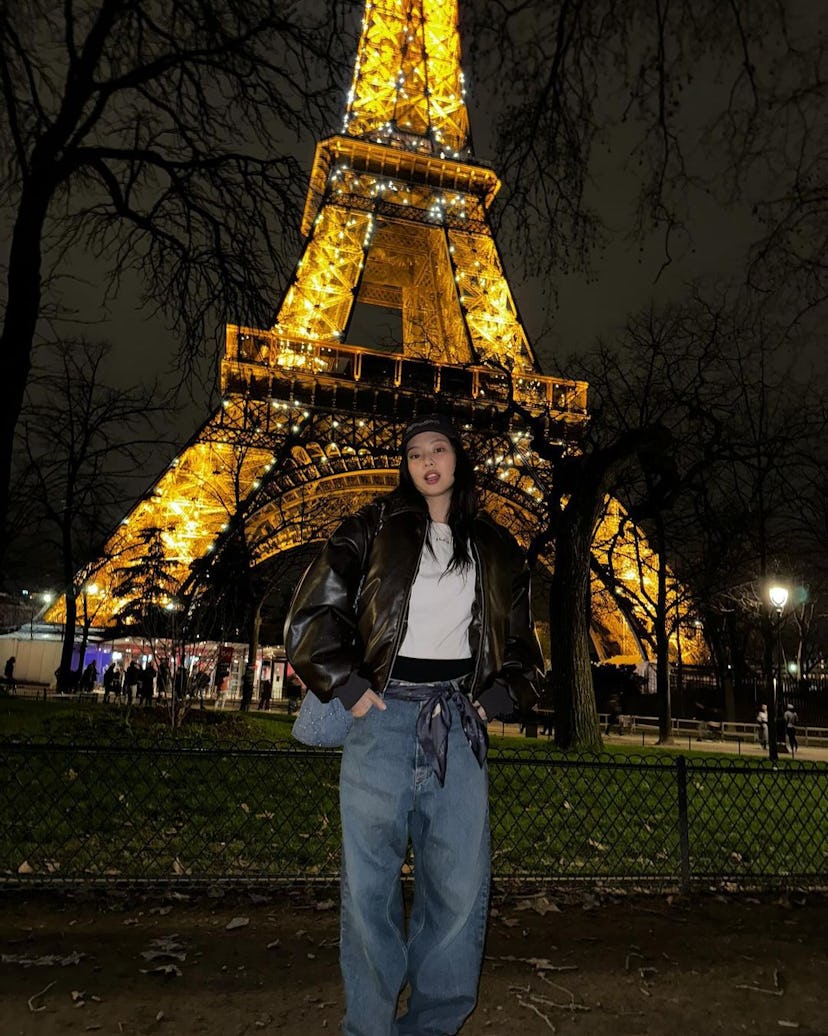 Jennie was in town for Chanel’s fall 2024 show, but spent most of her downtime in baggy denim rather than the French brand’s signature tweed. For a trip to the Eiffel Tower, the star slipped into low-rise trousers that she styled with a scarf-turned-belt. A delicate touch to an otherwise utilitarian look. From there, Jennie added on a cropped white t-shirt from Alaïa that she paired with an oversized leather bomber. Accessories were kept simple, and very practical for a day of sightseeing, in the form of a black baseball hat and a blue Chanel tote bag.