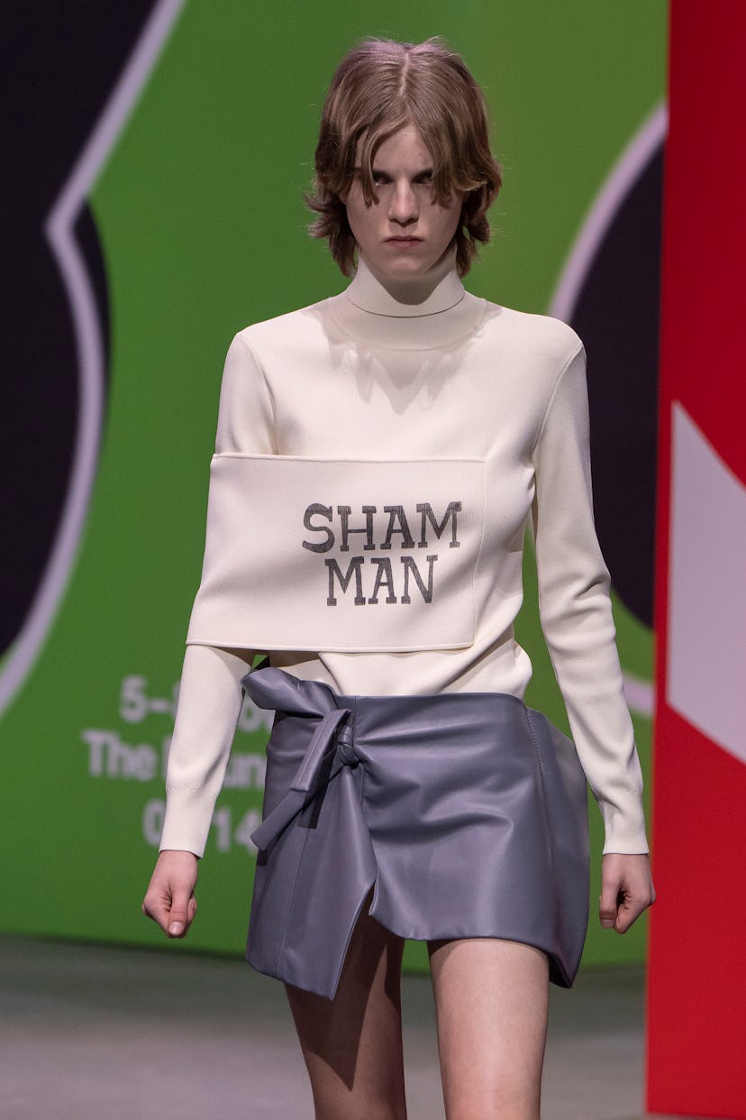 Michael Clark, the Scottish dancer and choreographer, along with Jonathan Anderson’s own archives of 15 years, were the subjects of inspiration for the collection. Inside the Roundhouse in Camden—where many of Clark’s performances have previously taken place—models wove between structures featuring some of the dancer’s most famously controversial and memorable posters (“Enjoy God’s Disco,” read one). Meanwhile, they wore odes to him: white Michael Clark logo tank tops, destroyed sweaters with glitter-tipped fingers, and tops with references to the artist’s work. Clark is infamously an eccentric dresser who has collaborated with other maximalists like Leigh Bowery. The yellow smiley face short overalls were a more literal interpretation of one of Clark’s costumes.