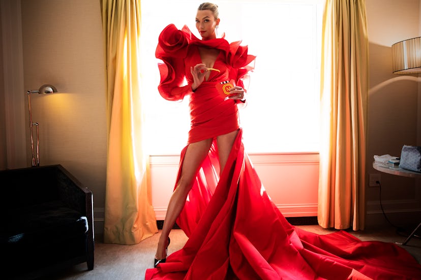 Hours before she was due to walk the red carpet at the 2021 Met Gala, Karlie Kloss stood at the window of her hotel room at The Mark in New York City taking pictures of the crush of fans stationed outside. They were waiting for her, along with the other attendees getting ready on the Upper East Side, to emerge from double doors out front and load into black SUVs on their way to the steps of the Metropolitan Museum of Art. Surely none of the onlookers were ready for Kloss, who donned a show-stopping crimson Carolina Herrera dress custom made by the label’s designer Wes Gordon, who collaborated with Kloss on the piece. Its dramatic, 1980s-inspired sleeves were an homage to the house’s founder, Carolina Herrera, and the entire dress was made from 25 yards of silk. And when Kloss walked onto the street, there were audible gasps and cheers from the crowd.