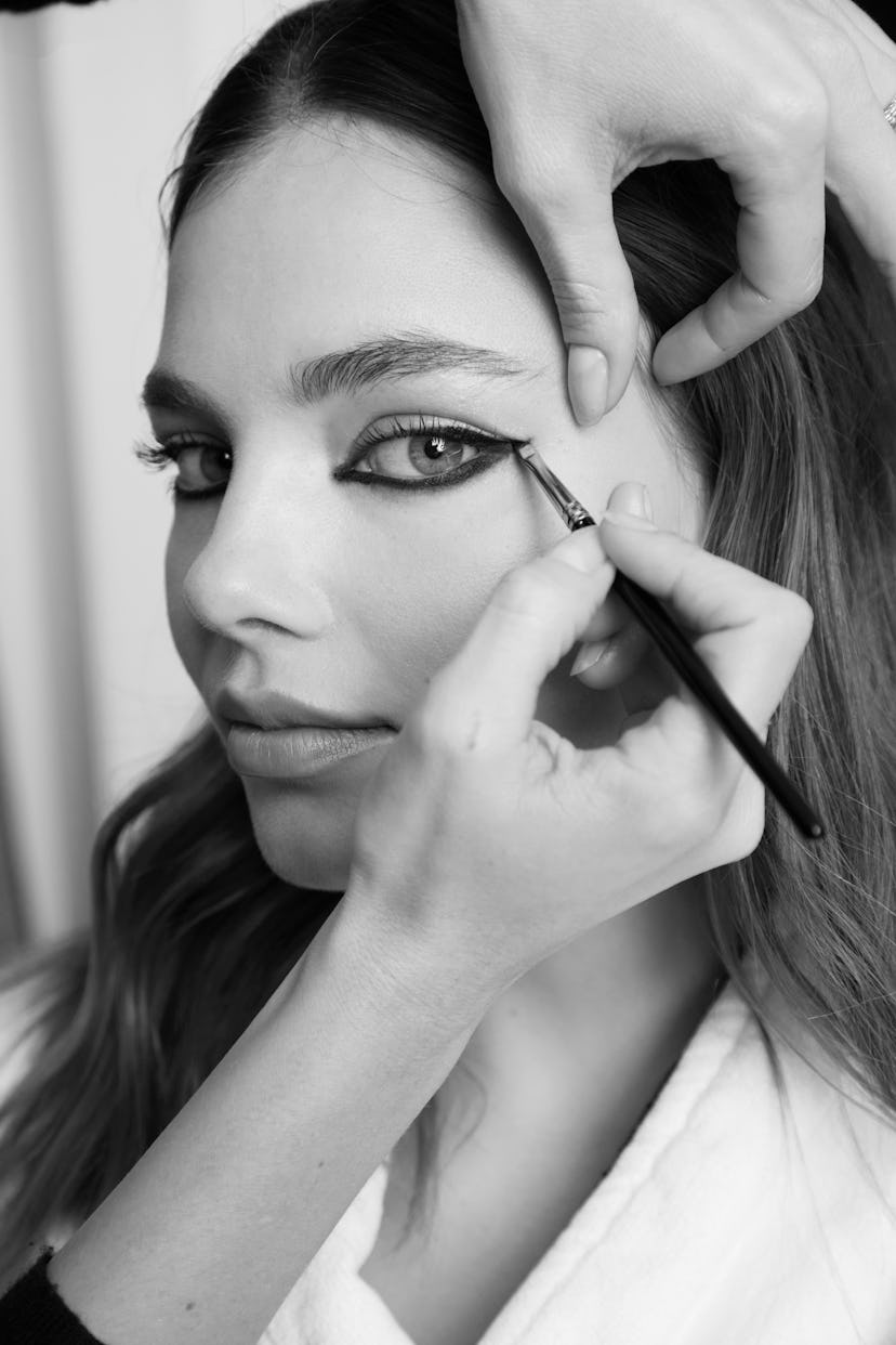Using Chanel No. 5 Les 4 Ombres eyeshadow palette <3. We wanted to do something bold with a little punk twist. My makeup artist Cyndle Komarovski did an inverted cat eye focusing the liner on the lower lash line and adding a gold metallic shimmer to the lid. We did a bold eye and kept the rest of the makeup fresh and natural.