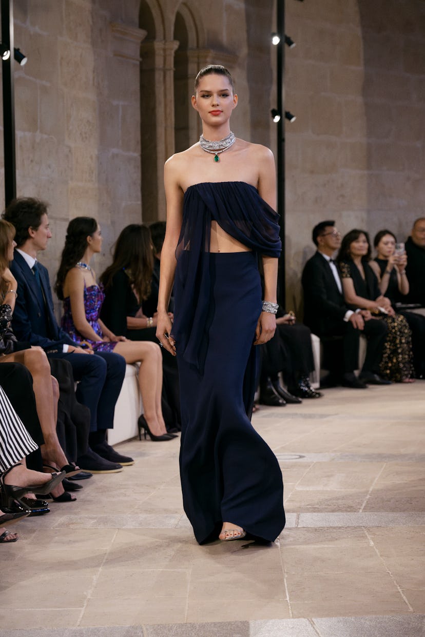 Looking for something that will stand out in a crowd? A special bauble that no one can snatch from under your nose, even at the chicest store on Madison Avenue? If that is the case, you might want to consider a billion-year-old uncut diamond. That was just one of the offerings on display at Louis Vuitton’s latest fine jewelry presentation, held this year in the Spanish island of Mallorca. The collection featured 110 one-of-a-kind pieces highlighting some of the most extraordinary stones sourced from all over the planet. An ode to craft and creativity, the Louis Vuitton jewel makers focused on the dual concepts of mastery and creativity. Extraordinary savoir faire was apparent in the way complex chokers were articulated to mold to the wearer’s body and move with it; the house’s creative spirit, meanwhile, was in full display through unexpected gemological combinations. Consider, for example, a necklace with a fiery triangular opal set among diamonds and paired with a 28-carat emerald drop, which required 1500 hours of work; or another necklace consisting of over 2000 diamonds and 114 pearls, intertwined to form a precious rope and topped with a six-carat pigeon-blood ruby. The setting in which these treasures were displayed was no less spectacular: the Bellver castle, dating back to the 13th century, where the kings of Mallorca once lived. A live orchestra performed as models wearing made-to-measure gowns created by Nicolas Ghesquière to complement the jewelry walked around the fortress’s circular tower. There was no shortage of spectacular moments; below, just a few of our favorites.