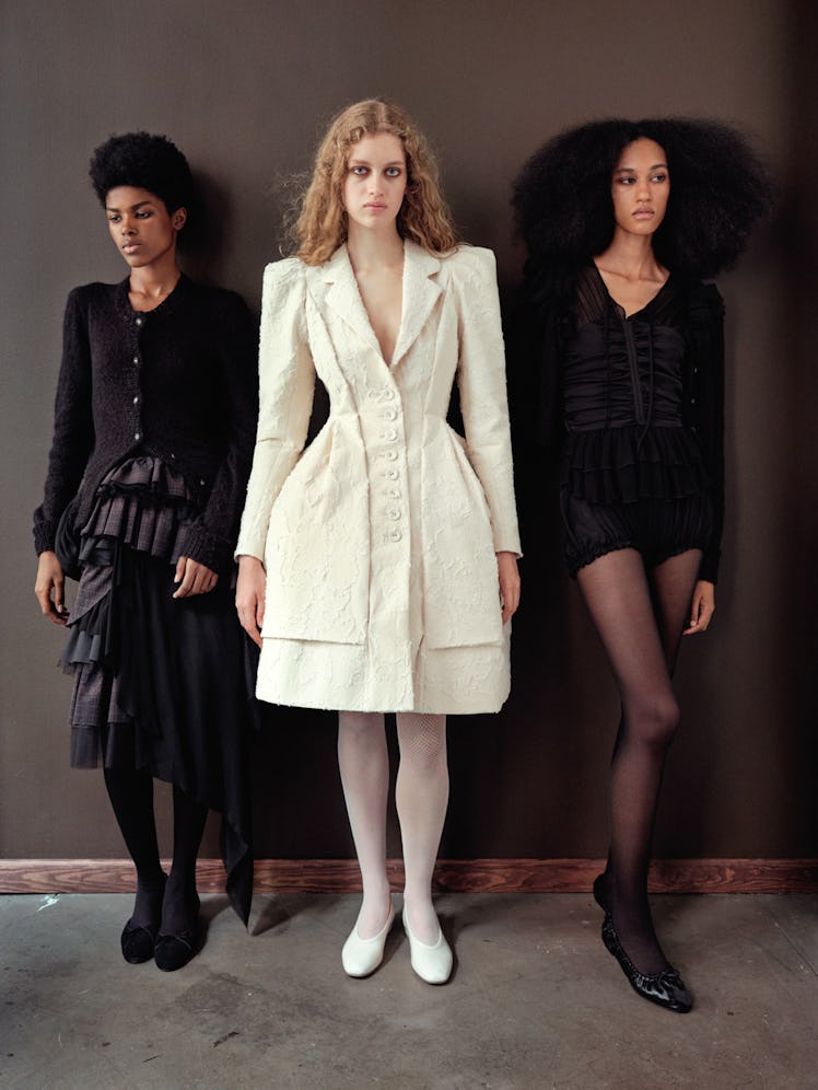 Tolegen’s work is often ethereal, but her most recent collection marked a turn toward structure, with exaggerated tailoring, including puffed shoulders and nipped-in waists that evoked Victorian dolls. There were also menswear looks—oversize black cardigans and loose pants styled with feminine ballet slippers—which she’s been sprinkling in since fall 2024.
