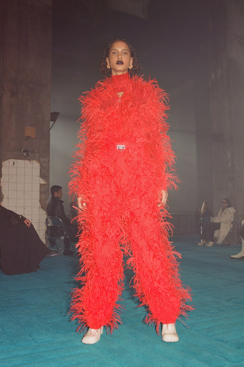 THE LOOK: With the ease of faux-fur wrap coats and vibrant color pops carefully placed within the collection, Simons and Prada are proving themselves to be the dream team.