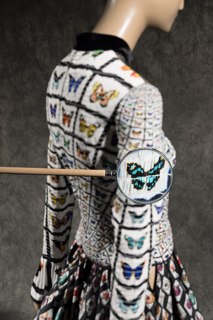 Next comes “The Senses,” a section that allows visitors to hear what some of these objects sound like in motion (in one case, guests can touch a recreation of a 1948 Molyneux dress, made in muslin by FIT graduate student Katherine Shark). “Aviary,” “Specimens,” and “Anatomical Theatre” provide examples of the most common form of cabinets of curiosities—taxidermy (or sometimes live) birds and animals and anatomical specimens presented during a time when the human body was still very much a mystery to scientists and doctors. Through archival pulls, Hill and her team have proven that centuries later, these themes still fascinate the public, from the grotesque vibe of a rib-adorned dress to the beauty of an intricately beaded Tom Ford design that turns the wearer into a human zebra.