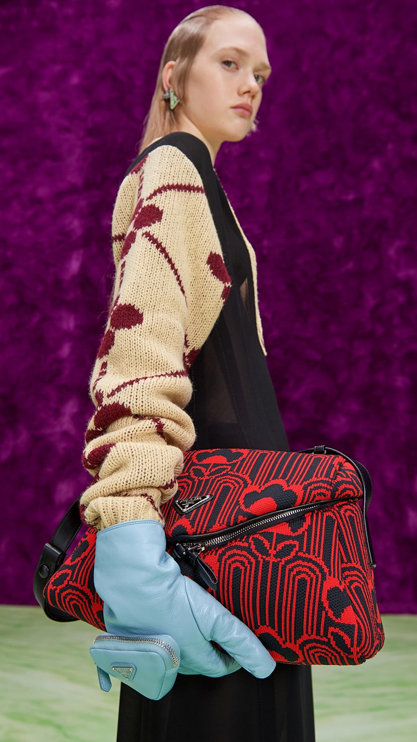 Simons had previously carried his signature slogans over to Prada, peppering phrases like “picture yourself: a triangle-shaped labyrinth, spinning round” throughout his Prada debut. This time, though, the only letters to be found were the five on the house’s triangular logo. Per usual, they accented handbags, some of which were miniature and attached to models’ gloves. The tiny bag trend continues, though Simons and Mrs. Prada haven’t gone so far as to make them into jewelry just yet.