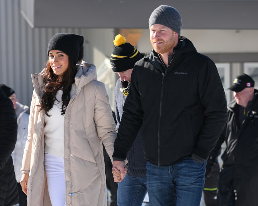 Both Harry and Meghan looked bundled up for the subzero temperatures. Meghan hopped on the Winter Whites trend, sporting a crisp turtleneck sweater and matching pants. She styled those pieces with a longline puffer jacket, a black beanie, and snow boots. Glam was kept low-key, too, in the form of tousled waves and rosy cheeks. Harry, for his part, continued the casual feel of Meghan’s look—opting to pair dark-wash jeans with a black Eddie Bauer coat. The Prince rounded out his look with a gray beanie and black sunglasses.