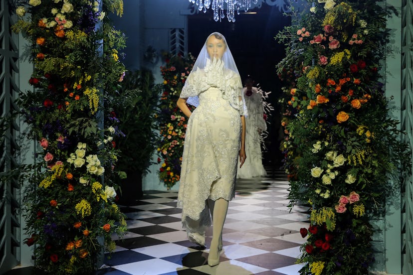 There are a few things you’re bound to see at a Richard Quinn show: florals of all kinds, latex gimp suits, and heavy embellishment glimmering down the runway. For fall 2023, the designer delivered all of that and more; models in BDSM-inspired costumes with cat ears and body harnesses strode across the checkered floor of the Seymour Leisure Centre in West London into a garden of flowers, where a live orchestra played. But this season, the designer also doubled down on bridal, with nearly half of the collection devoted to all kinds of looks for all kinds of brides.