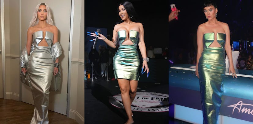 Think of Miranda Priestly’s classic “cerulean blue” monologue in The Devil Wears Prada, except in this version, the journey of the dress starts with Owens’s runway show, then on to Kardashian’s public approval. From there, it trickles down the line of celebrities, first appearing on more prominent names such as Paloma Elsesser and Cardi B. It then filters down to Heidi Klum and Katy Perry, who wore a holographic green version on American Idol last May. Now the list of those who have embraced the dress with the geometric, plunging neckline is too long to count.