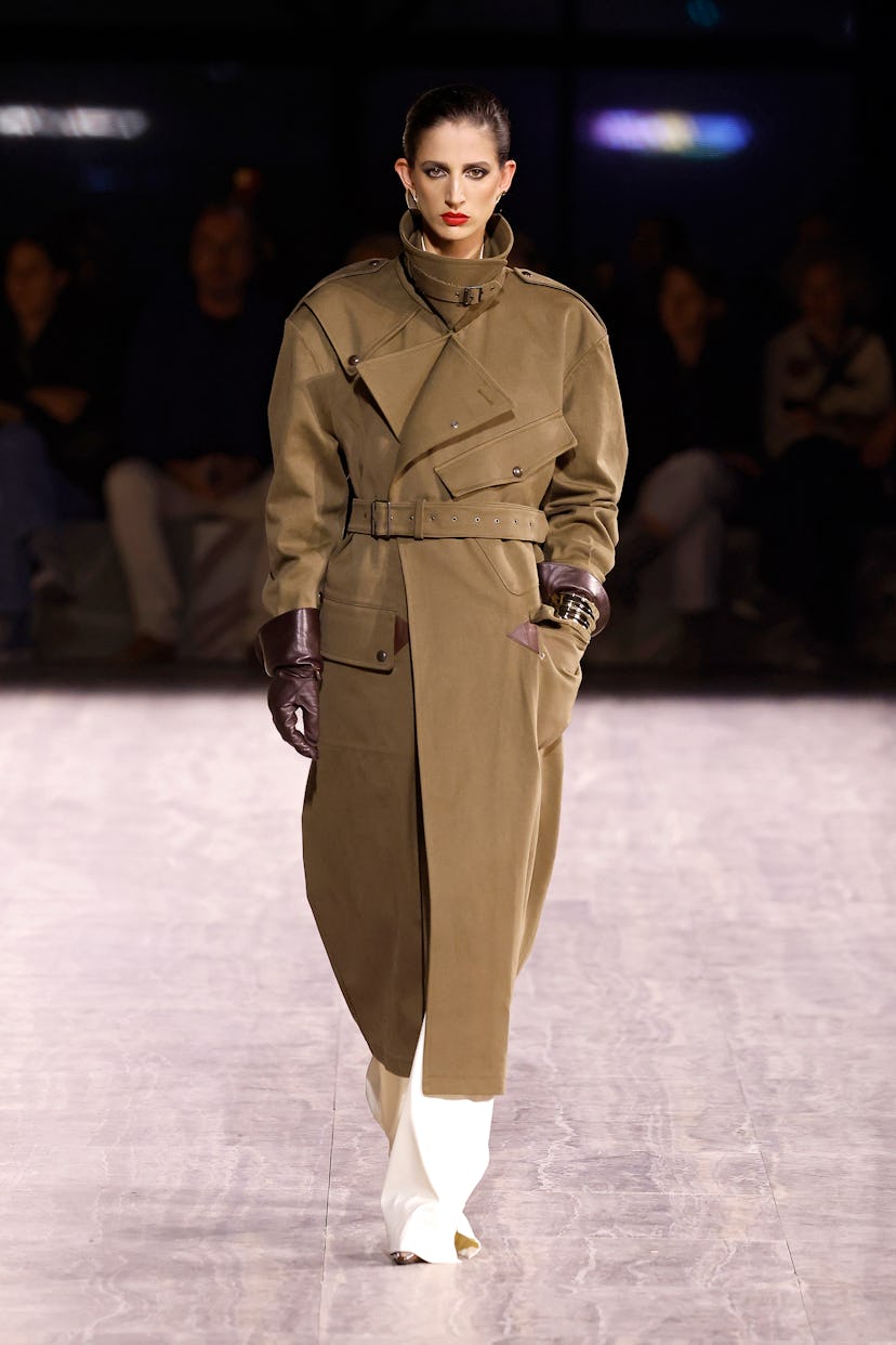 Out of the 49 looks in this collection, nearly all of them referenced those classic Saint Laurent silhouettes, including the caftan-style dress. Of course, Vaccarello added in a bit of his own signature aesthetic, too—turning the usual beiges and tans to brick reds, saffron yellows, and deep marigold shades. “The stance [of this collection] is pragmatic, with couture-informed daytime looks and a looser silhouette than in past seasons,” the show notes explained. The designer also looked to a handful of famous women, like Amelia Earhart and the French test pilot Adrienne Bolland, for inspiration, as well as the concept of taking things from the male wardrobe and making them more feminine. (A fitting sentiment, since Yves Saint Laurent himself once said, “Chanel freed women, and I empowered them.”)