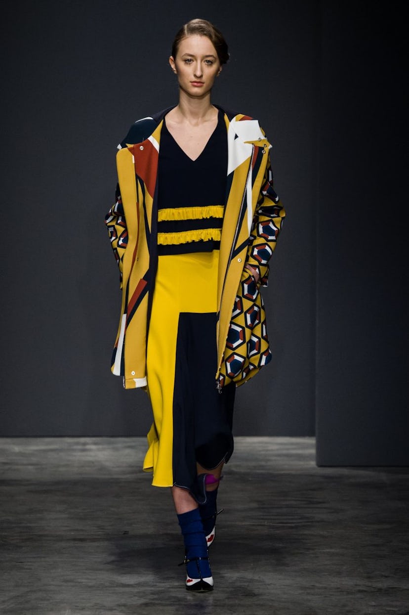Brognano’s Nicola Brognano, the 26-year-old designer who won Who is on Next last summer, drew inspiration from his experience working on the couture collections for Giambattista Valli and Dolce & Gabbana. “This season I thought of ‘Hot Couture,’ a kind of fake couture, an unpretentious approach to high fashion,” he explained of the collection, which included a red hot bustier dress with a tiered tulle skirt worn with a coordinating baseball cap.