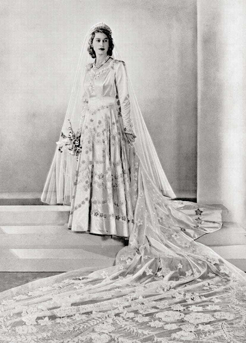 A look at Princess Elizabeth, future Queen Elizabeth II, on her wedding day to Prince Philip on November 20, 1947. The fabric for the wedding dress had to be purchased using ration stamps, as in 1947, the British government was still rationing many products. The designer, Norman Hartnell, embroidered jasmine, lilac, and other flowers on the dress, whose design was said to be inspired by the Botticelli’s Primavera. Photo courtesy of Getty Images.