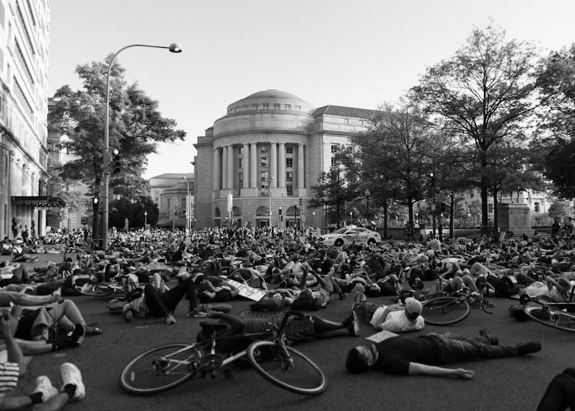 Protestors lay on the ground for 8 minutes and 46 seconds—the amount of time that police officer Derek Chauvin knelt on the neck of George Floyd—in Freedom Plaza in Washington, D.C. on Wednesday, June 3, 2020. Photograph by Nate Palmer for W magazine.