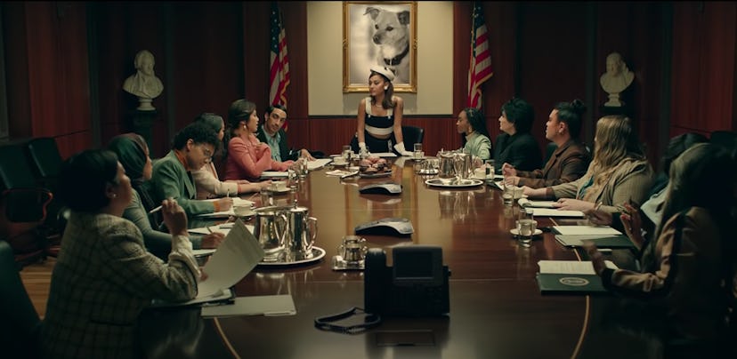Of course, debuting the video after the presidential debate wasn’t the only political message sent by the video. Grande—who has been quite vocal on social media about politics, and even kicked off her world tour in 2019 by having voter registration kiosks available at her concerts—can be seen in the video doling out awards to postal workers, an obvious jab at Trump’s anti-USPS sentiments, and working in the Oval Office with a diverse crew of women (and a portrait of her dog, Toulouse) is something that certainly has not come to pass during this current administration’s presence in the White House.