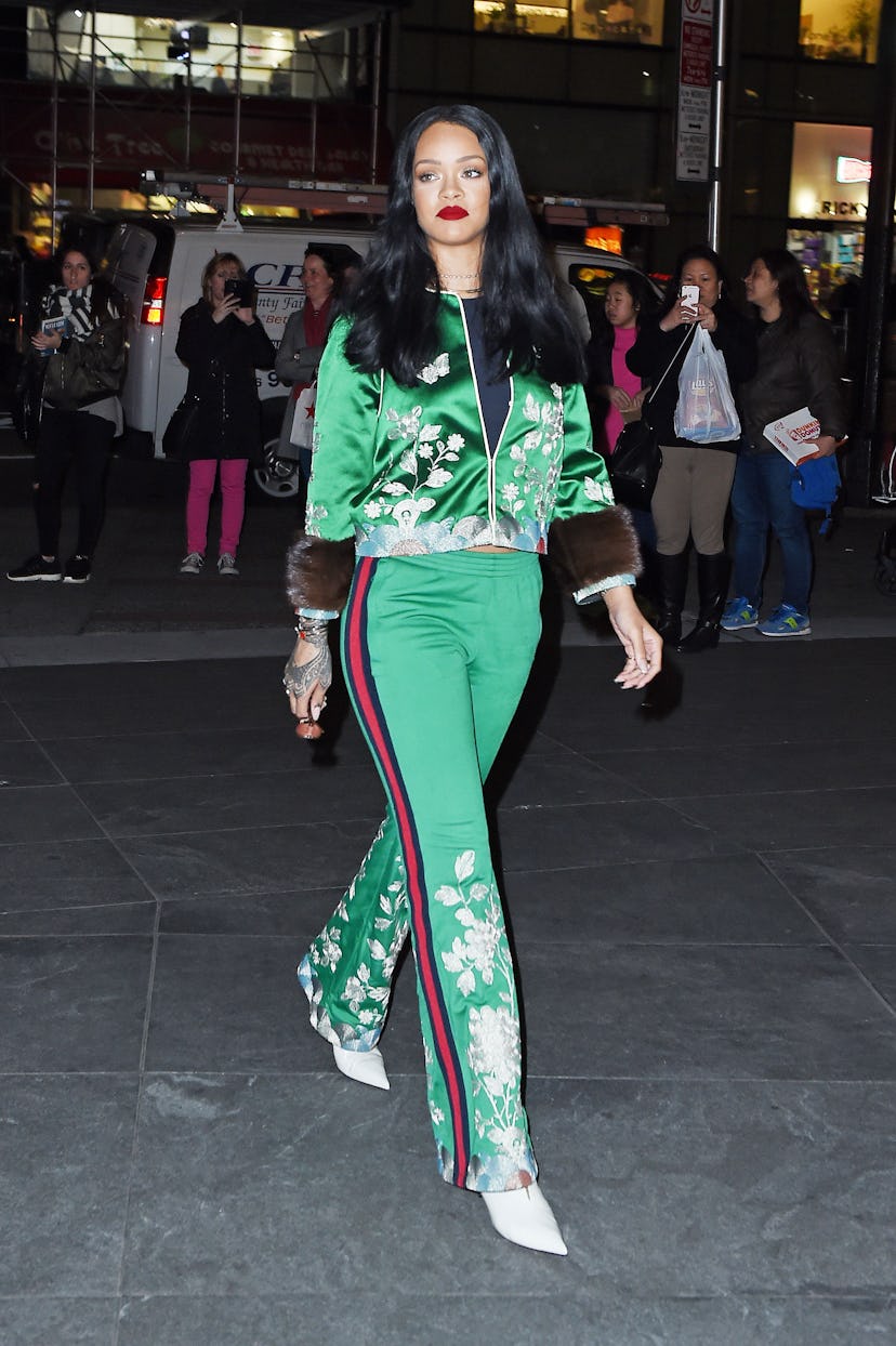 Why: There’s nothing like winding down after a busy evening (Rihanna played a sold-out Barclays Center on Sunday) in a pair of quality sweats. The other day, RiRi was spotted in a tie-dyed Elder Statesman number. On Monday, she was in Gucci. She just knows how to make them work, work, work, work, work, work — with help from luxe embellishments like the fur wrist cuffs and silk embroidery combined with the side-webbing of her pants, a track-suit hallmark.