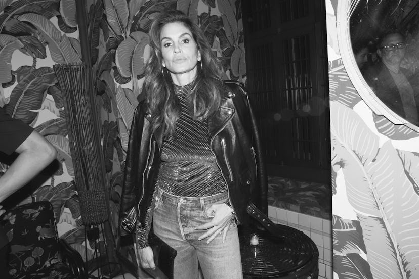 On Tuesday night, the supermodel took a break from cheerleading from the sidelines, however, to step into the spotlight herself, hosting a dinner to celebrate her new denim collaboration with Re/Done. Held at Indochine, the intimate evening brought out a slew of fashion names including Helena Christensen, Delilah Belle Hamlin, Will Peltz, Mel Ottenberg, and Alyssa Miller, as well as the entire Gerber clan: Kaia, Presley, and dad Rande. Crawford held court in a corner both with Re/Done co-founders Sean Barron and Jamie Mazur, sipping on a spicy margarita (with Dos Casimigos tequila, of course), where she talked Kaia’s big week, what makes a good pair of jeans, and rolling around in the sand in denim for Gilles Bensimon.