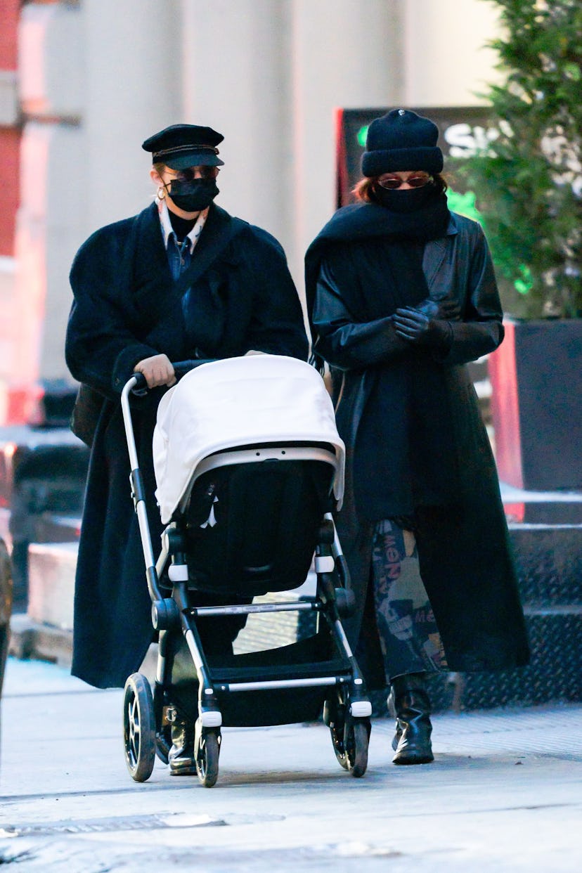 Everyone knows that Bella Hadid has been out and about in New York as of late, whether that involves posing next to her own Calvin Klein advertisement inside of a midtown Macy’s or cementing her status as a plant mom by shopping for greenery (with which to presumably decorate her home) in Chinatown. But in this most recent paparazzi photo set, the supermodel can be seen bundled up in all black head to toe, with a black face mask, beanie, leather trench coat, boots, and scarf, as she assists her sister push the stroller down the SoHo streets.