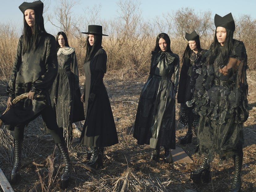Models Lara Stone at IMG, Bella Hadid at IMG, Anna Ewers at Women, Frederikke Sofie at DNA, Jamilla Hoogenboom at Women, Maartje Verhoef at Women, Ondria Hardin at DNA, Jing Wen at Supreme, Julia Hafstrom at IMG wear, from left: Simone Rocha dress. Kenzo dress. Erdem gown. Céline blouse and pants. Céline shirt and pants. Simone Rocha dress and cape. Céline dress and pants. Boss dress, top, and sweater; Anne Fontaine neck piece; Mokuba ribbon. Salvatore Ferragamo dress; Anne Fontaine neck piece; Caroline Constas ruffle collar; Mokuba ribbon. Cornelia James gloves; Falke tights; Dansko shoes (on all).