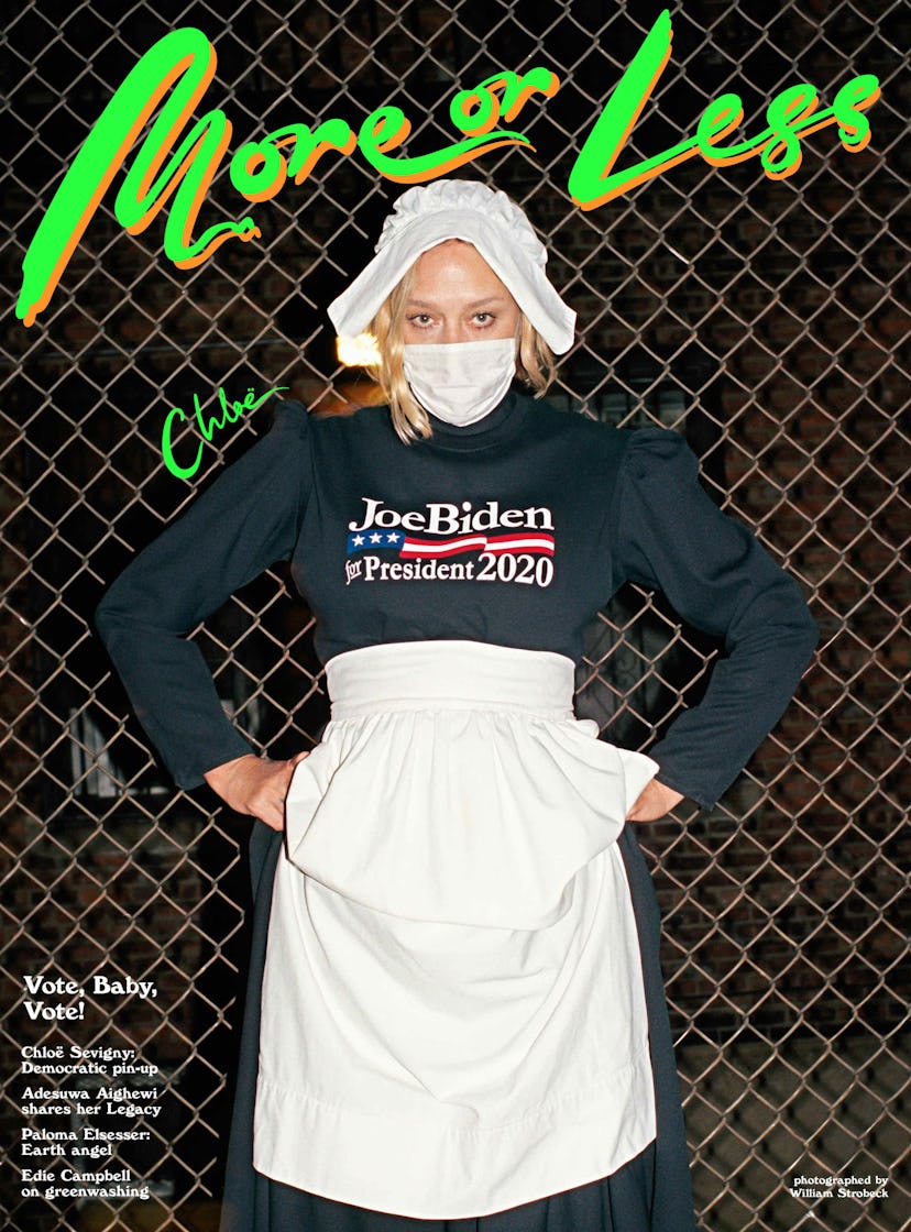 Then I had this last-minute idea that we should do a “Vote Biden” cover because of the proximity of the issue coming out to the election. I was like, who would be crazy enough to do this and have enough traction? So I texted the Chloë Sevigny, and she was like, “Yeah, I’ll totally do it.” Then she sent me this weird reference when she was in Provincetown, Massachusetts. She passed some stand in a shop and there were these mannequins dressed in costumes and then they were wearing shirts that said “Gay for Joe.” So we got Marc Hundley to make a t-shirt by him that said “Gay for Joe.” That one’s not on the cover, but there’s a fold-out poster inside where she’s wearing that t-shirt. And on the cover, she’s dressed more bizarre. We’re not trying to make any specific statement. It’s more sort of just being avant-garde.