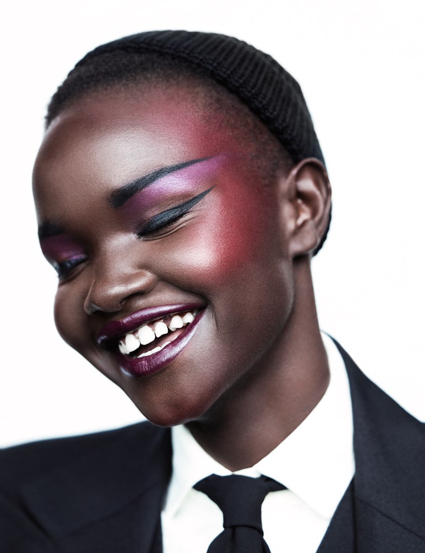 Philips used Dior Forever Skin Correct 7N Neutral and Dior Backstage Glow Face Palette in Universal to perfect Changkou’s skin. He kept eyeliner to a minimum, but blended shades from Dior Backstage Eye Palette in Rosewood Neutrals for maximum impact on her lids. He finished the look with Dior Addict Stellar Halo Shine in Superstar on her lips. Sacai coat; Maison Margiela vest; Gucci shirt, hat, and tie.Photographed by Willy Vanderperre; makeup by Peter Philips; styled by Olivier Rizzo. Hair by Louis Ghewy for Oribe Hair Care at Management + Artists; manicures by Anatole Rainey at Premier Hair & Make-up. Models: Akon Changkou at New Icon; Ilona Desmet at Girl Mgmt; Ruth Bell at the Society; casting by Michelle Lee Casting. Produced by Floriane Desperier at Entrée Libre; light technician: Romain Dubus; photography assistant: Yves Mourtada; digital technician: Henri Coutant; on set retouching: Stéphane Virlogeux; fashion assistants: Niccolo Torelli, Letizia Maria Allodi; production assistant: Arthur Debriffe; hair assistants: Delphine Bonnett, Olivier Noraz; makeup assistants: Miguel Ramos, JinDian Yang.