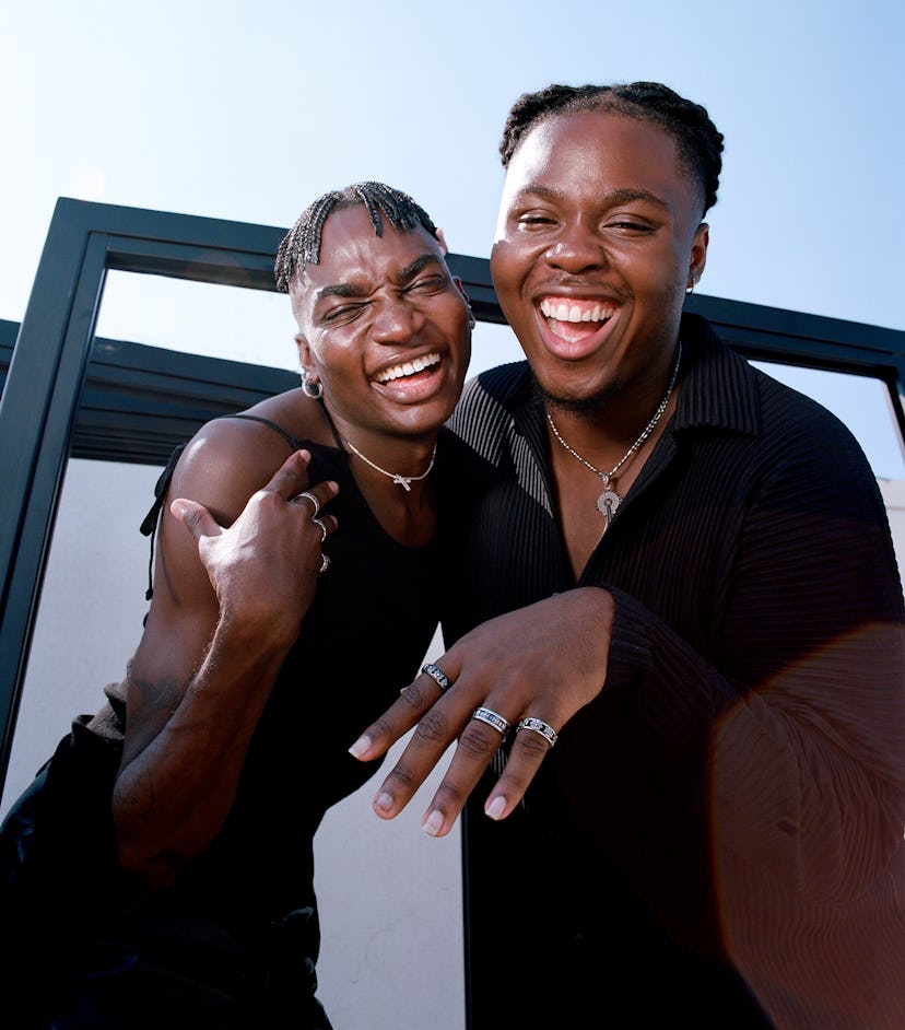 Photographed by Lindsay Ellary; styled by Rebecca Ramsey. Thompson: Ludovic de Saint Sernin top; Gucci shorts; his own jewelry. Dion: Homme Plissé Issey Miyake shirt; his own jewelry.