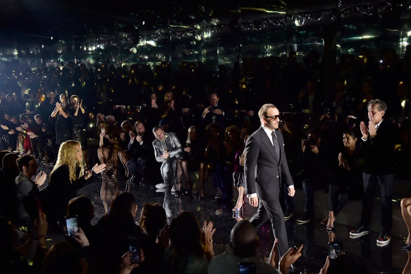 Then the lights went down and Tom Ford showed what was essentially a two-part, unisex collection: daytime first, with models coming down the runway in patchwork denim and jewel-tone monochrome suits that hearkened back to his early 2000s collections; then, nighttime. Gigi and Bella Hadid and Kendall Jenner, the current American modeling holy trinity, wore lacy lingerie-inspired looks.